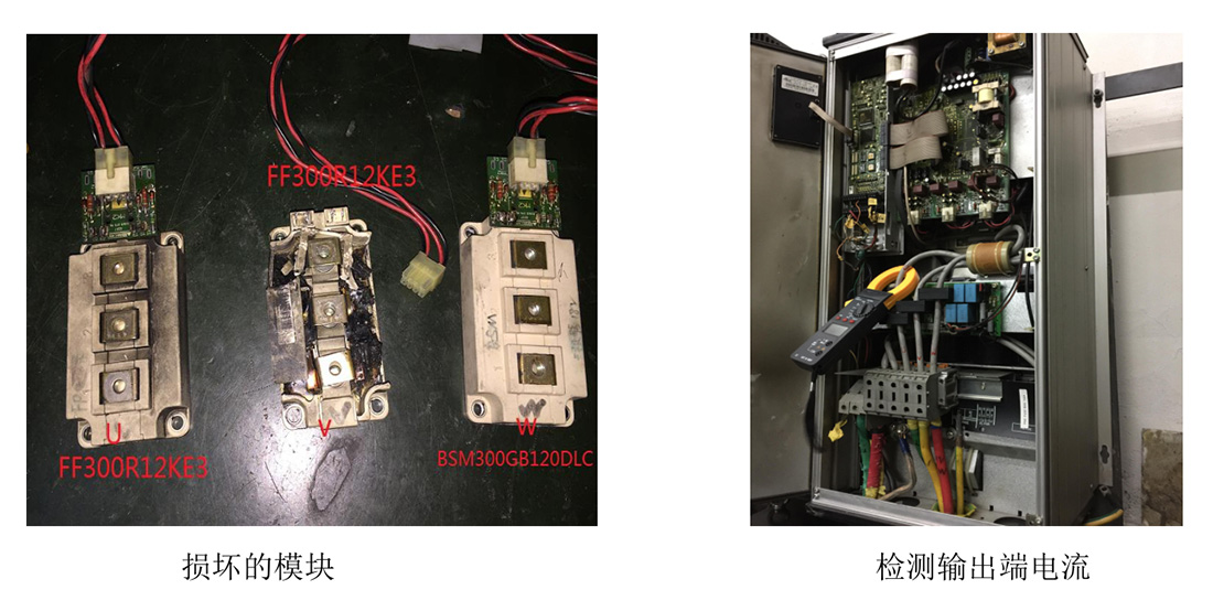 案例二:客戶反映故障報警“AL15”,為二次側電源故障,維修二次側電源電路。修好后現場裝機試機,檢測輸出側三相電源電壓平衡正常,輸出頻率45HZ時三相輸出電流為135A左右正常。連續運行3小時左右時變頻器發生故障停機,現場檢測電源驅動板未發現損壞,開關電源供電電路正常,驅動電路6路未發現短路、開路現象。V相IGBT模塊損壞(型號為 FF300R12KE3),U、W 正常。
