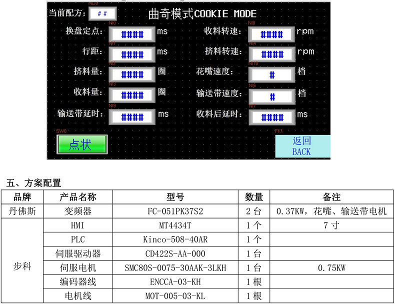 該設備只需在 HMI 上設定簡單參數,無需更換設備即可生產多種外形的曲奇餅干。步科提供的 PLC+HMI+伺服產品,無論從性能、穩定性,還是服務方面,都給客戶留下了深刻的印象