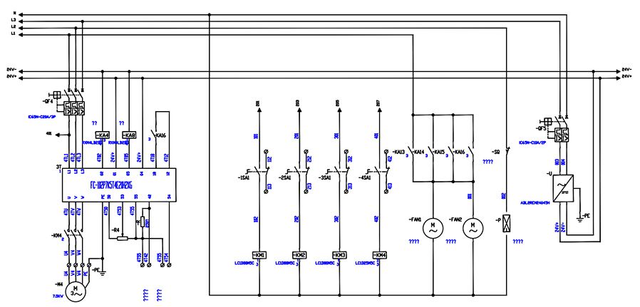 該空調(diào)系統(tǒng)有水泵6臺(冷卻水泵30KW為兩用一備、冷凍水泵30KW為兩用一備),及冷卻塔風(fēng)機(jī)2臺(功率4KW),在每一樓層配置1-3臺11KW風(fēng)機(jī)(共計(jì)24臺)進(jìn)行送風(fēng),目前均以工頻方式運(yùn)行。