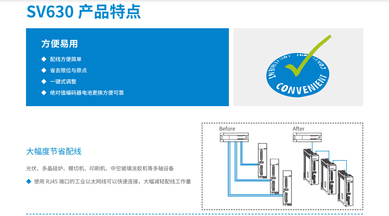 SV630 系列伺服是匯川技術研制的高性能中小功率的交流伺服產品。該系列產品功率范圍為0.05kW ~ 7.5 kW,采用以太網通訊接口,支持EtherCAT 、Modbus、CANopen 和CANLink 等通信協議,采用對應的通信接口,配合上位機可實現多臺伺服驅動器聯網運行。